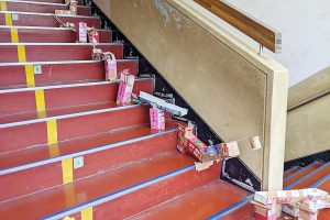 校舎内の階段を使ってピタゴラ装置をつくりました。