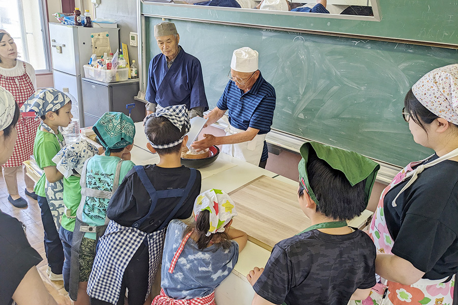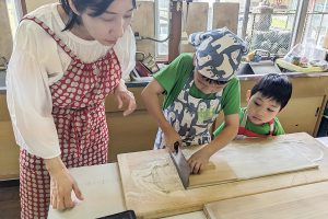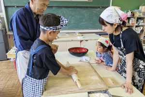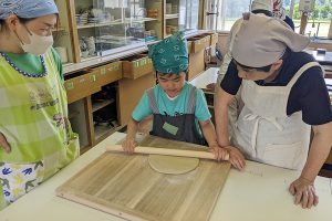 先生の所作・見本をまねながら、粉を混ぜて、練って、延ばして、切って、最後は試食しました。