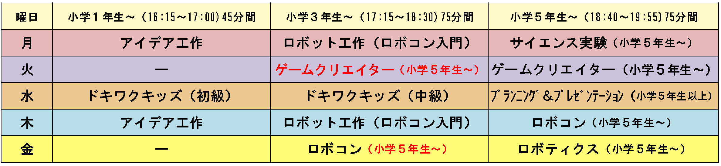 ※金曜日コース高学年クラス “電子工作ロボット” 講座は17:45-19:00(75分)で実施します。